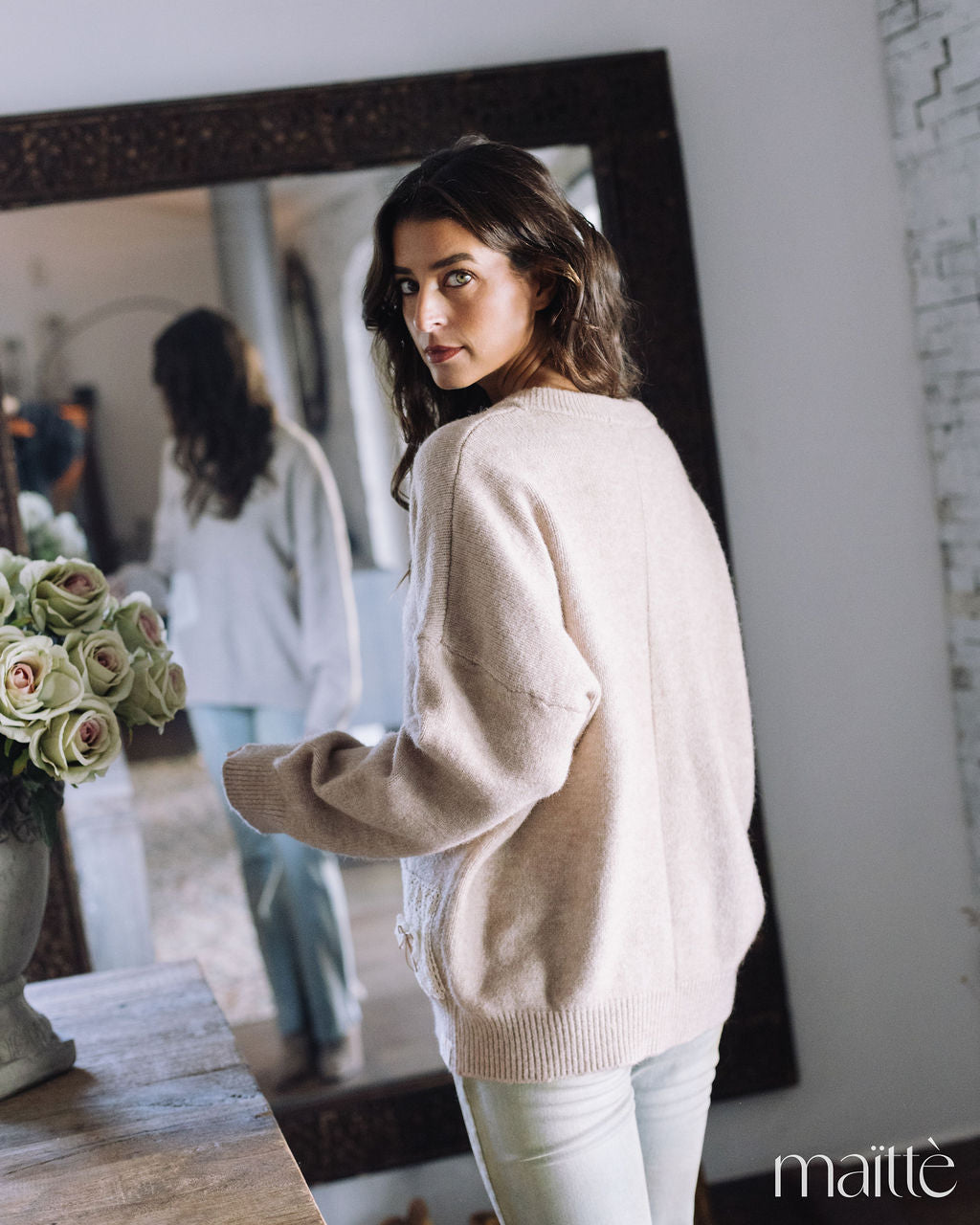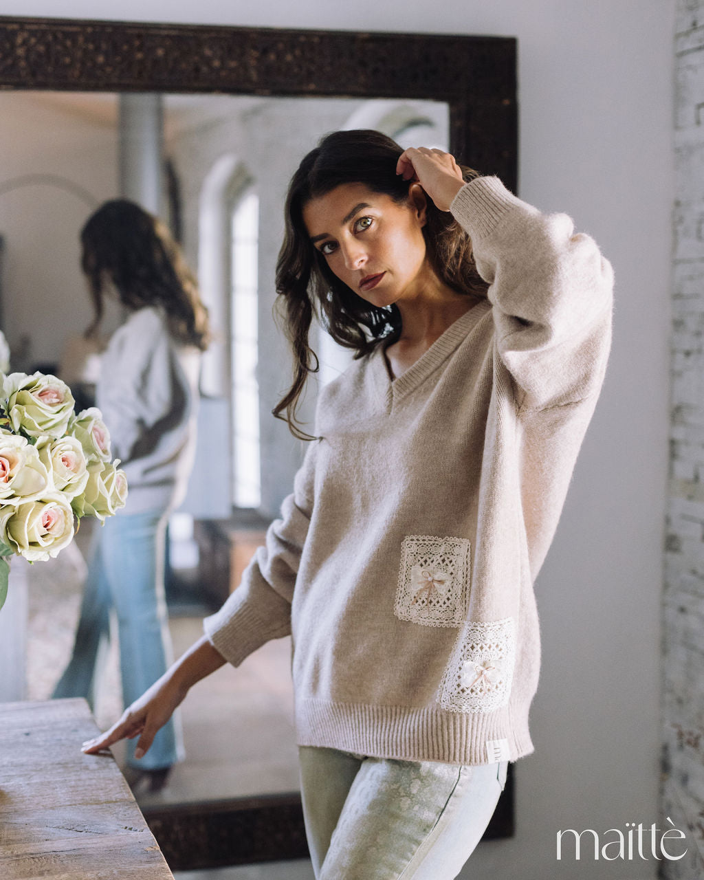 Camisola em malha bege com decote em V e aplicações me renda artesanal