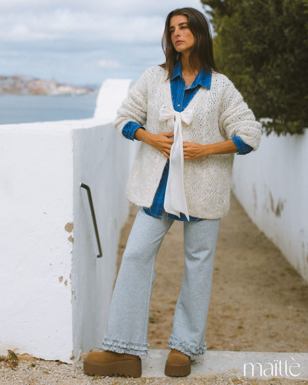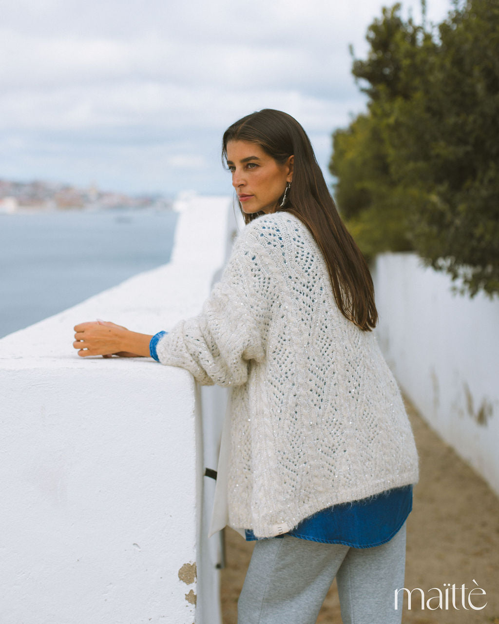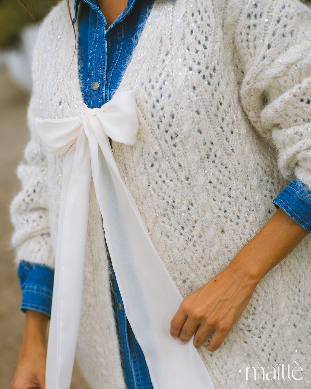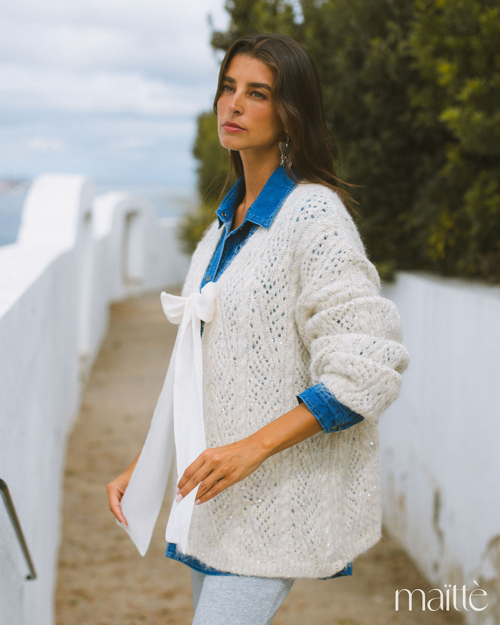 Casaco em malha pérola de ponto largo, com laço em tecido suave