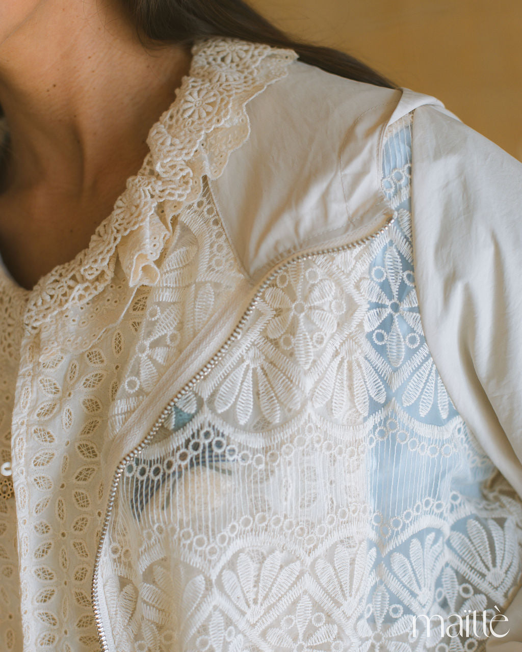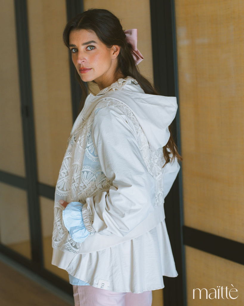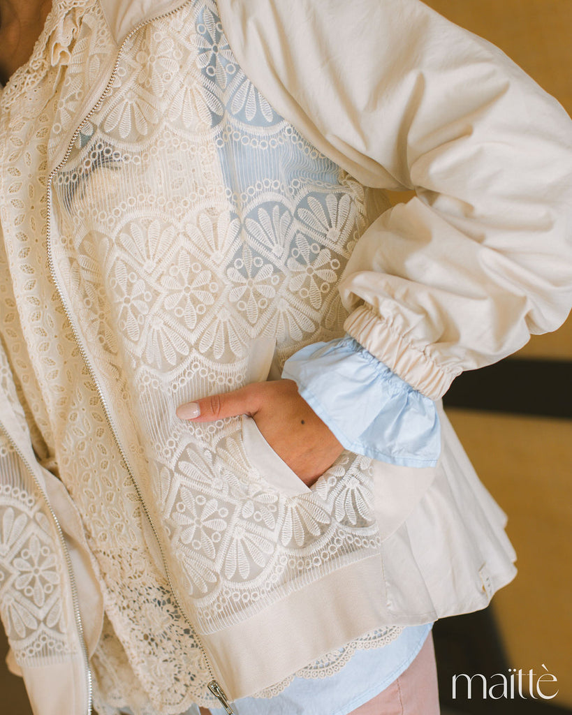 Casaco rendado em tom cru com aplicações rendadas