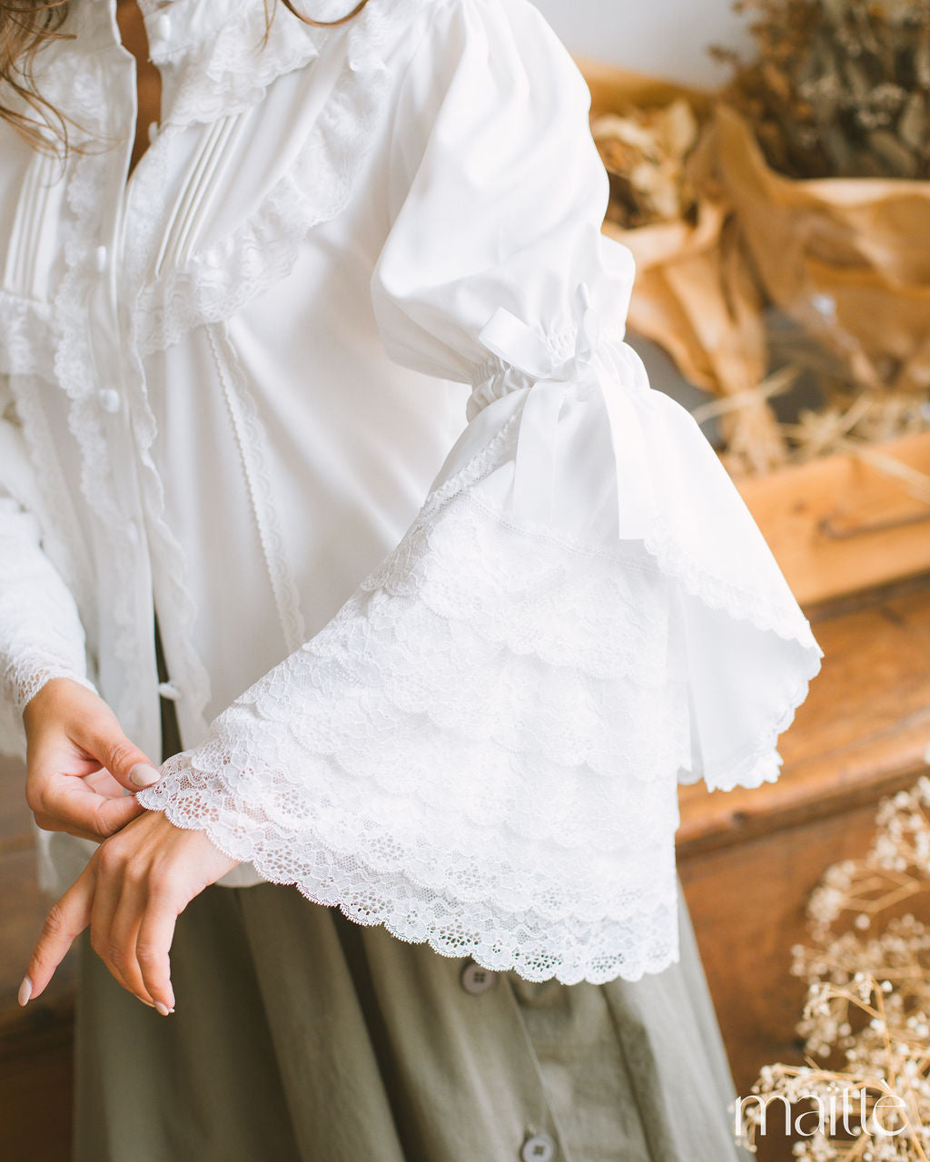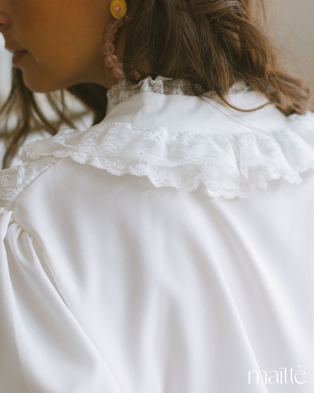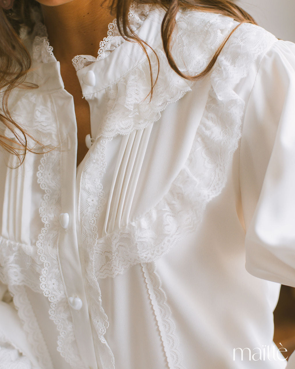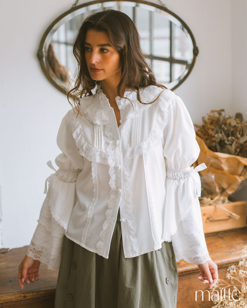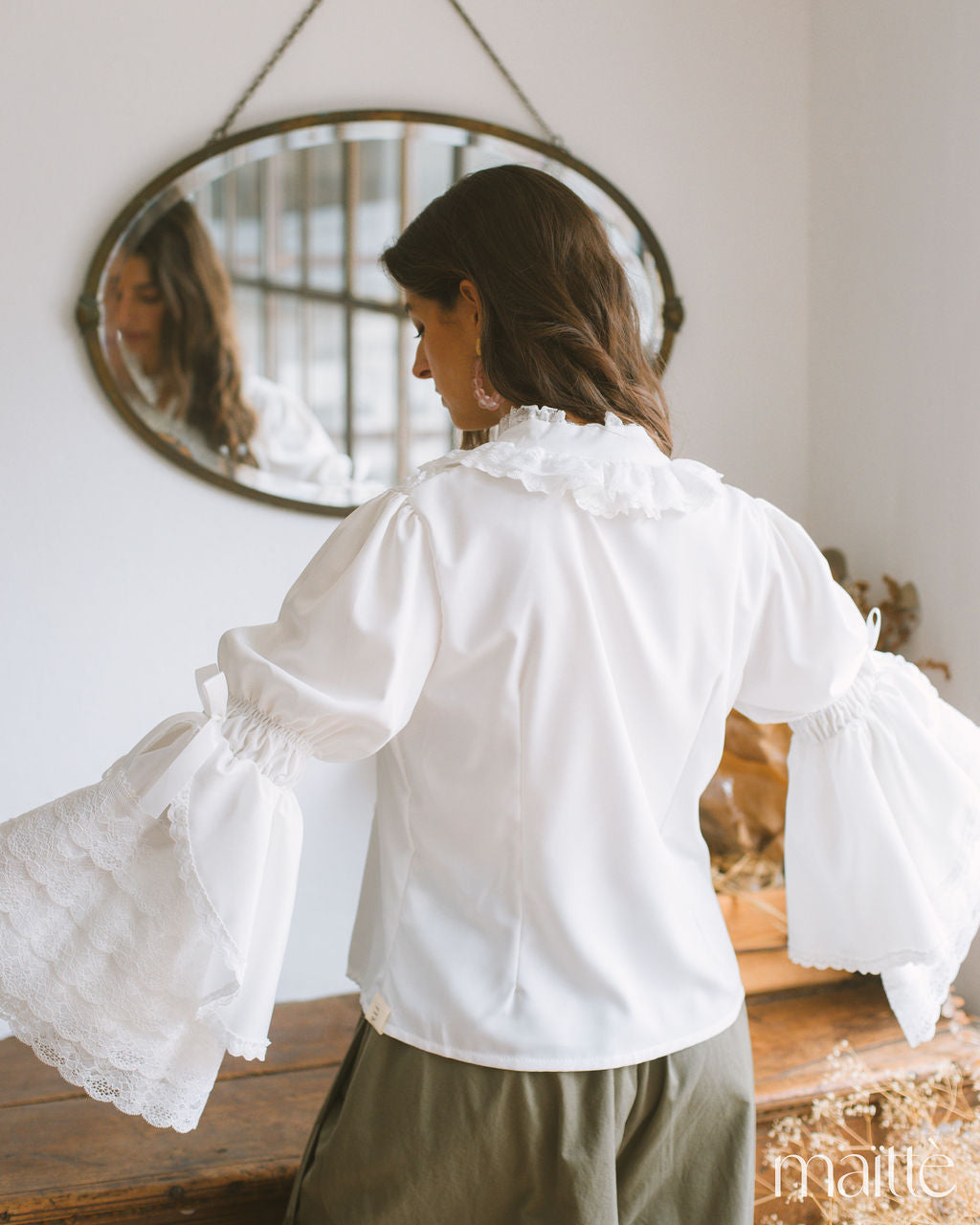Camisa branca de algodão com pormenores de renda, folhos no peito e manga com laços