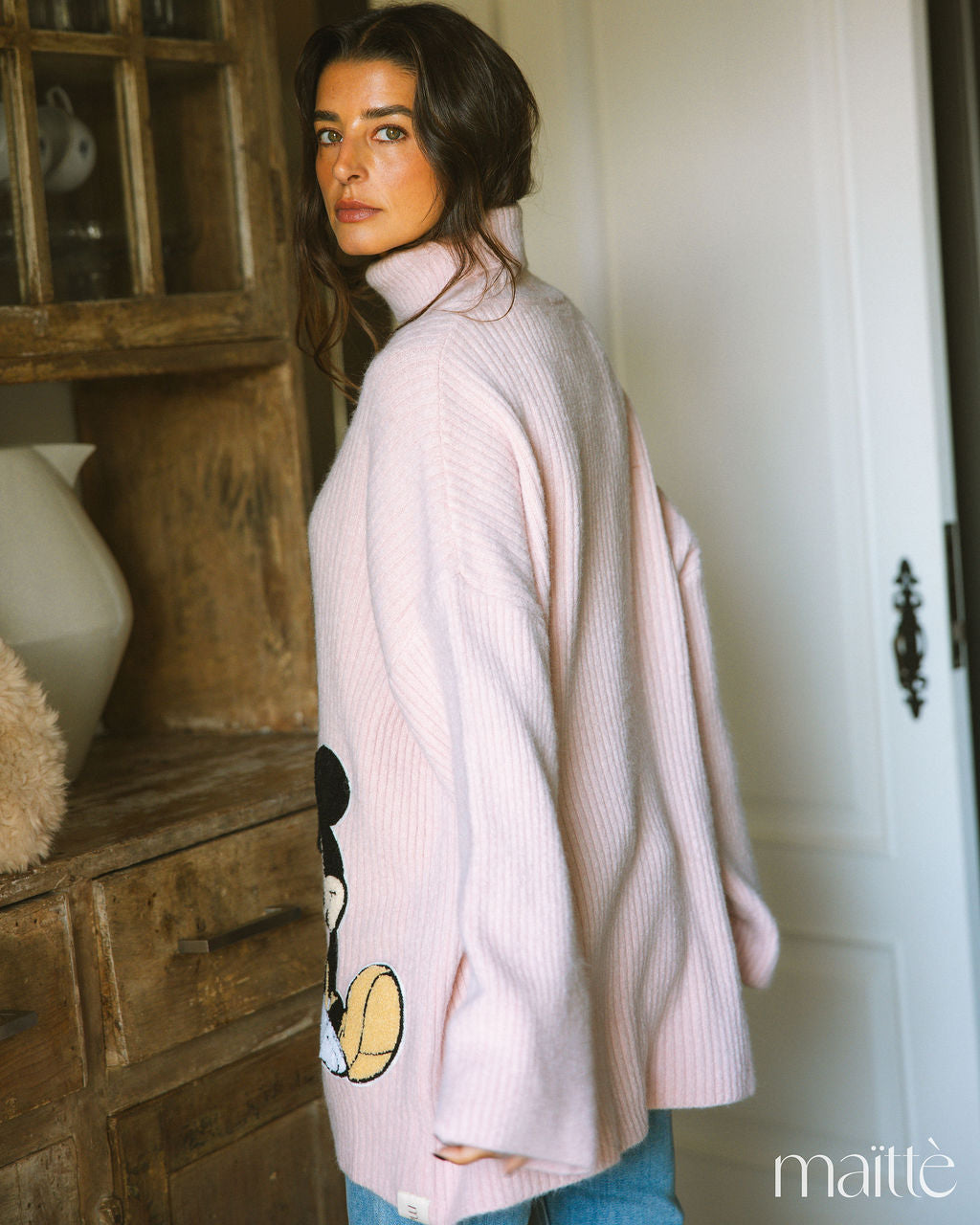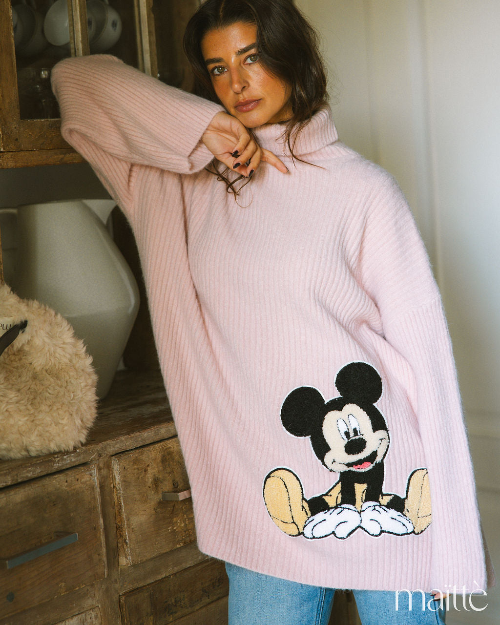 Malha rosa de gola alta e aplicação