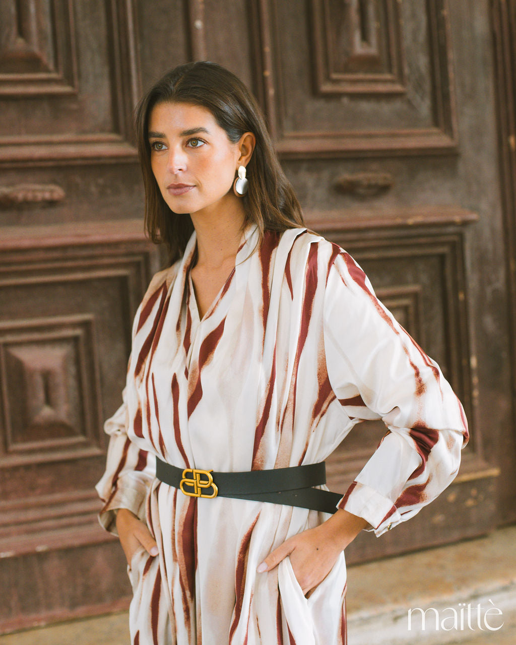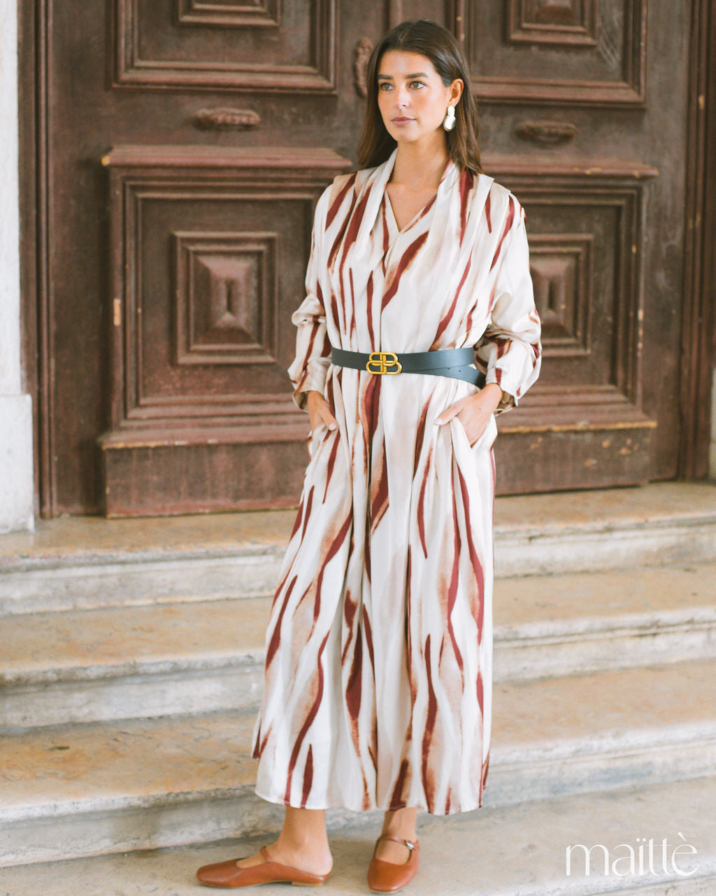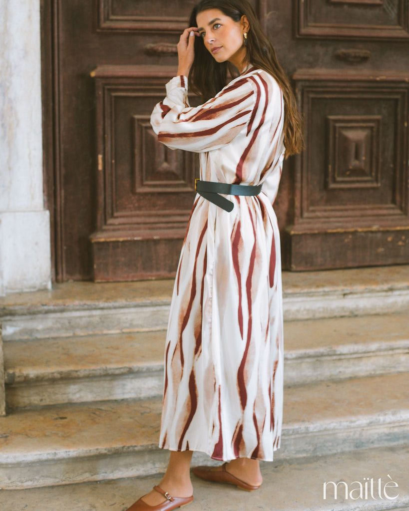 Vestido fluido de manga comprida com padrão em tons terrosos, decote em V e cinto incluído
