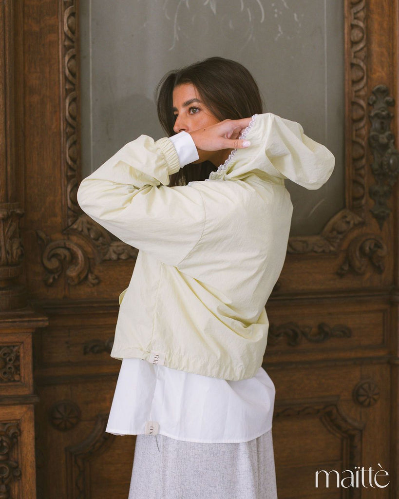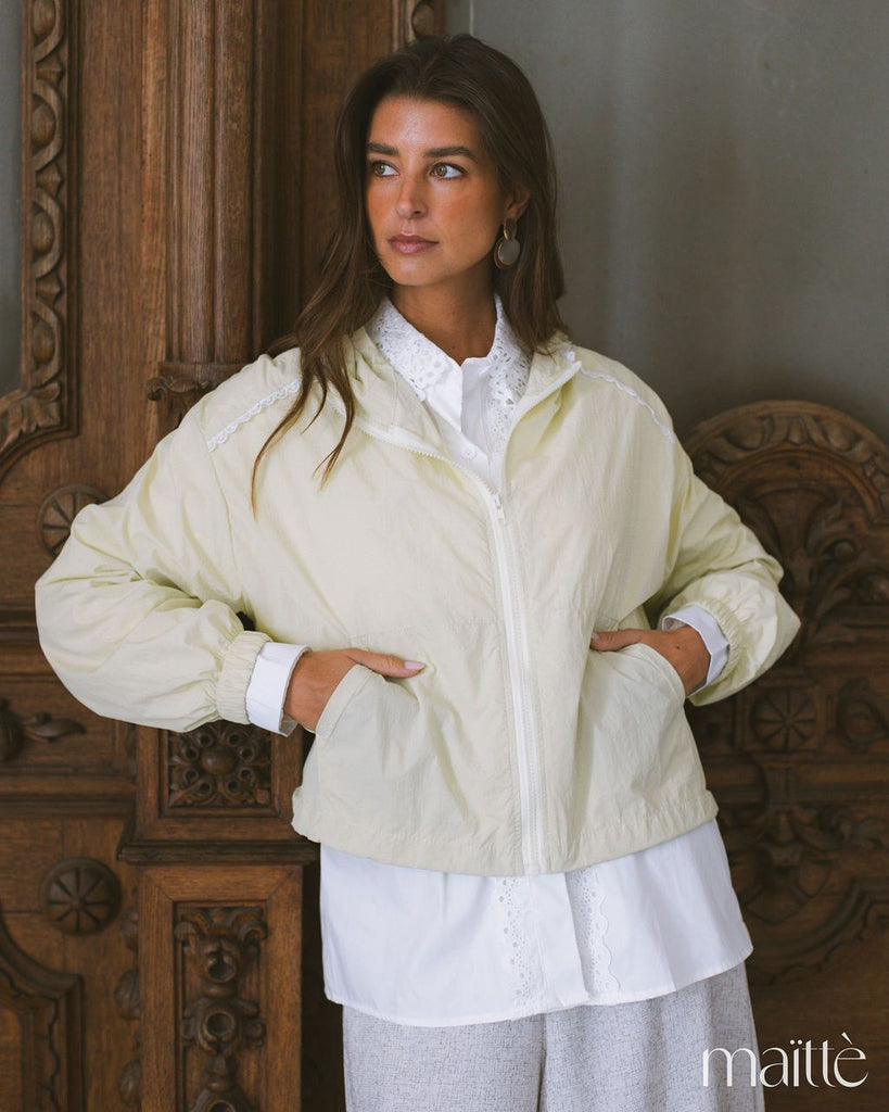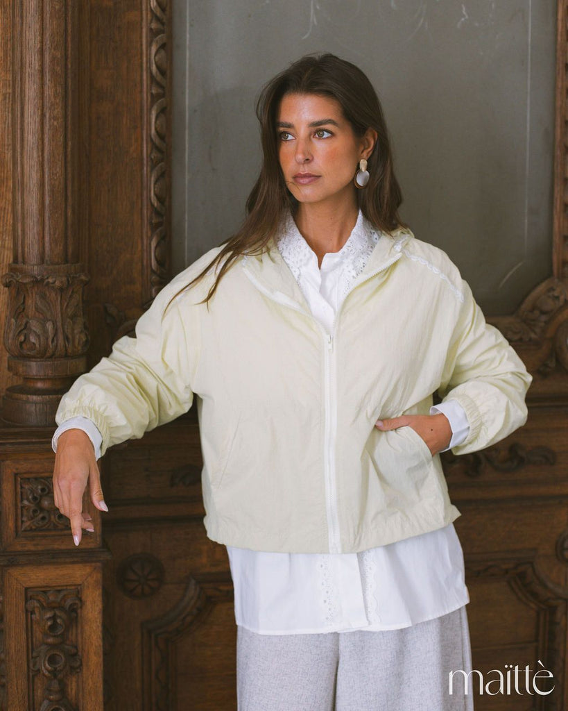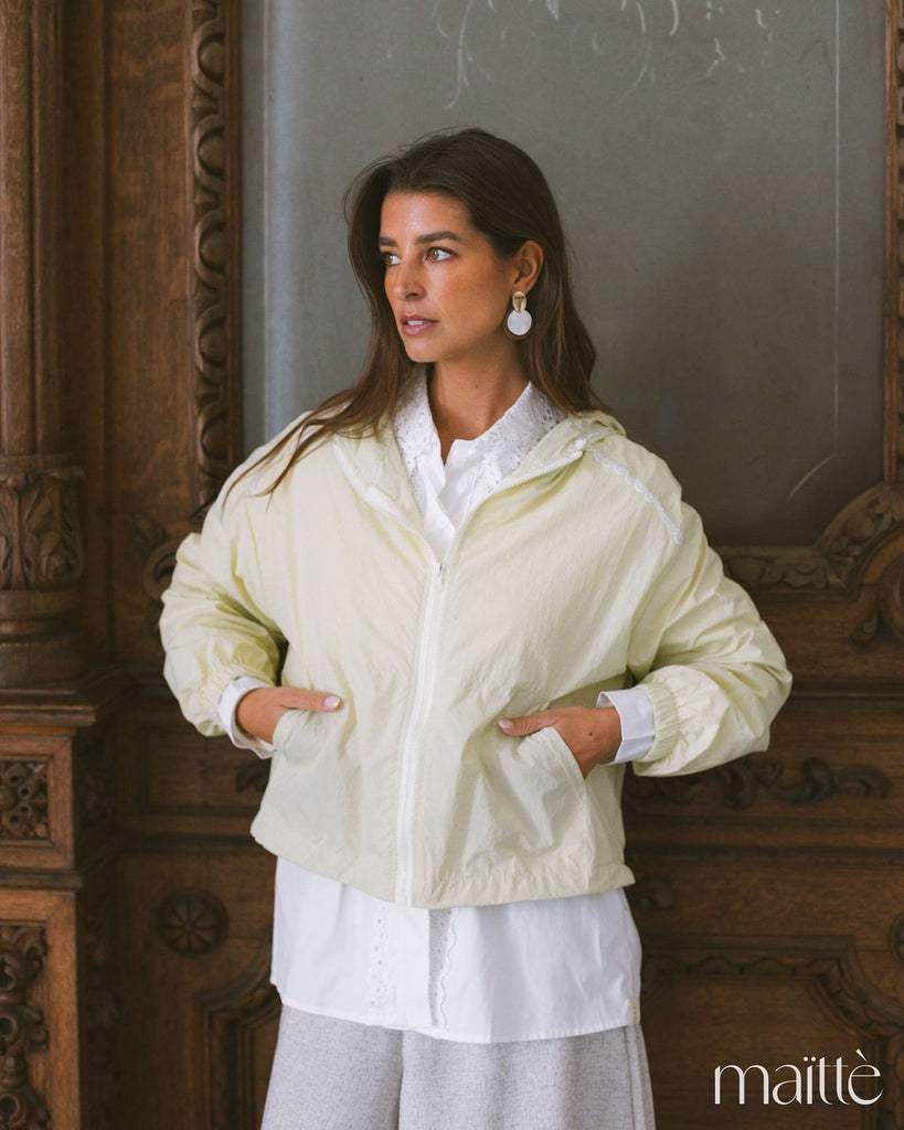 Anoraque verde claro com capuz e ajustes em baixo