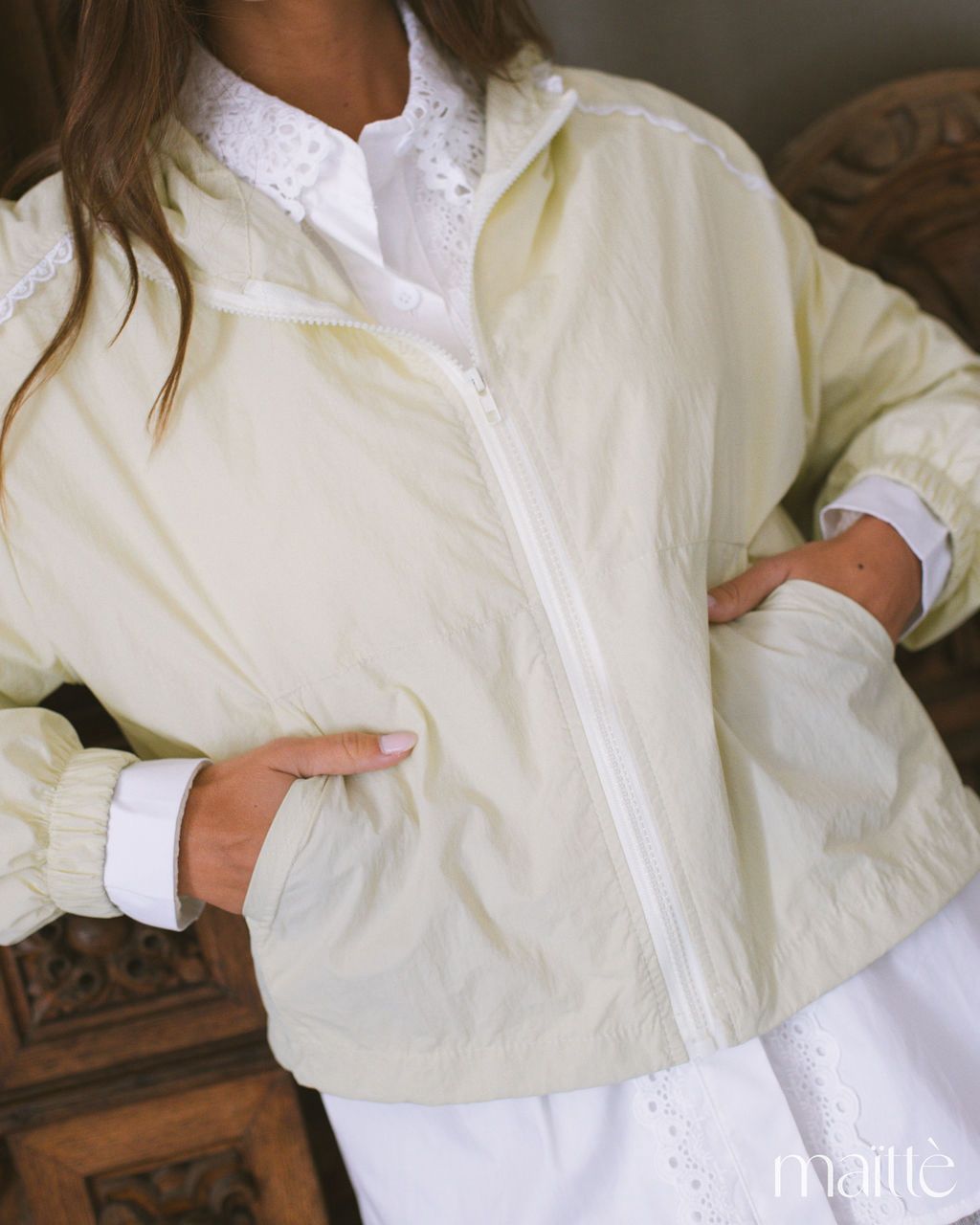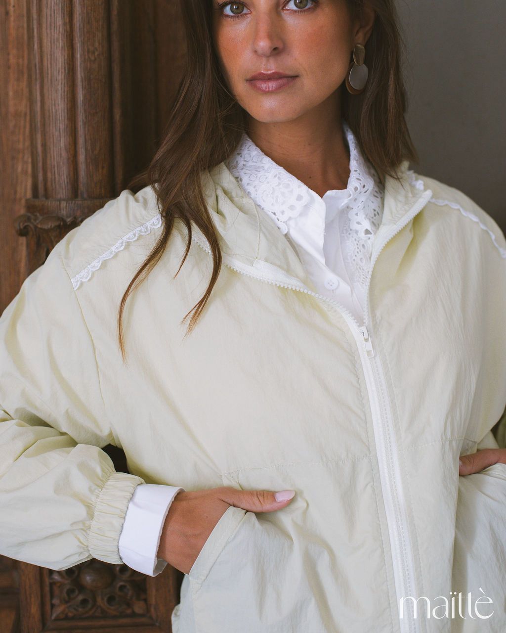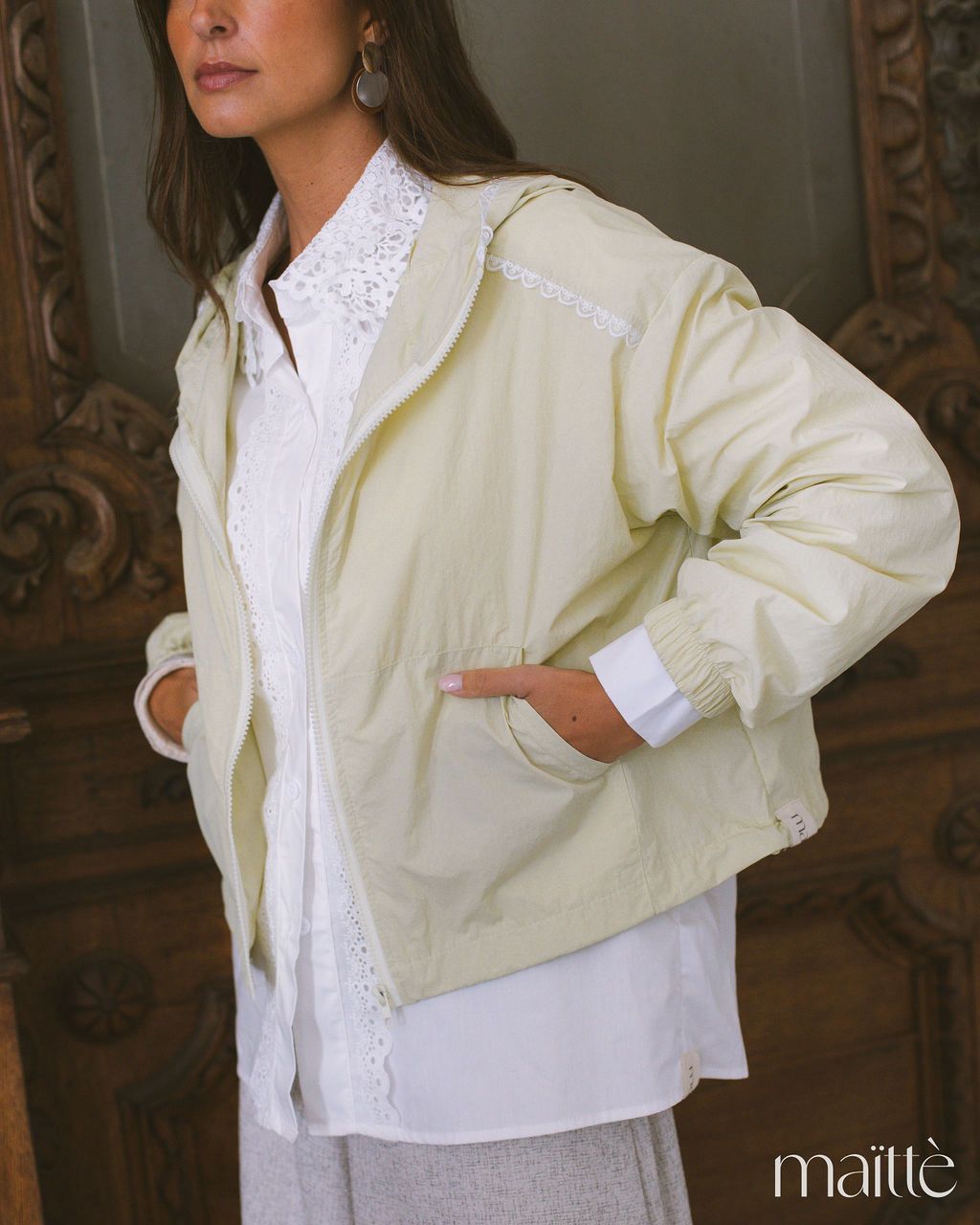 Anoraque verde claro com capuz e ajustes em baixo
