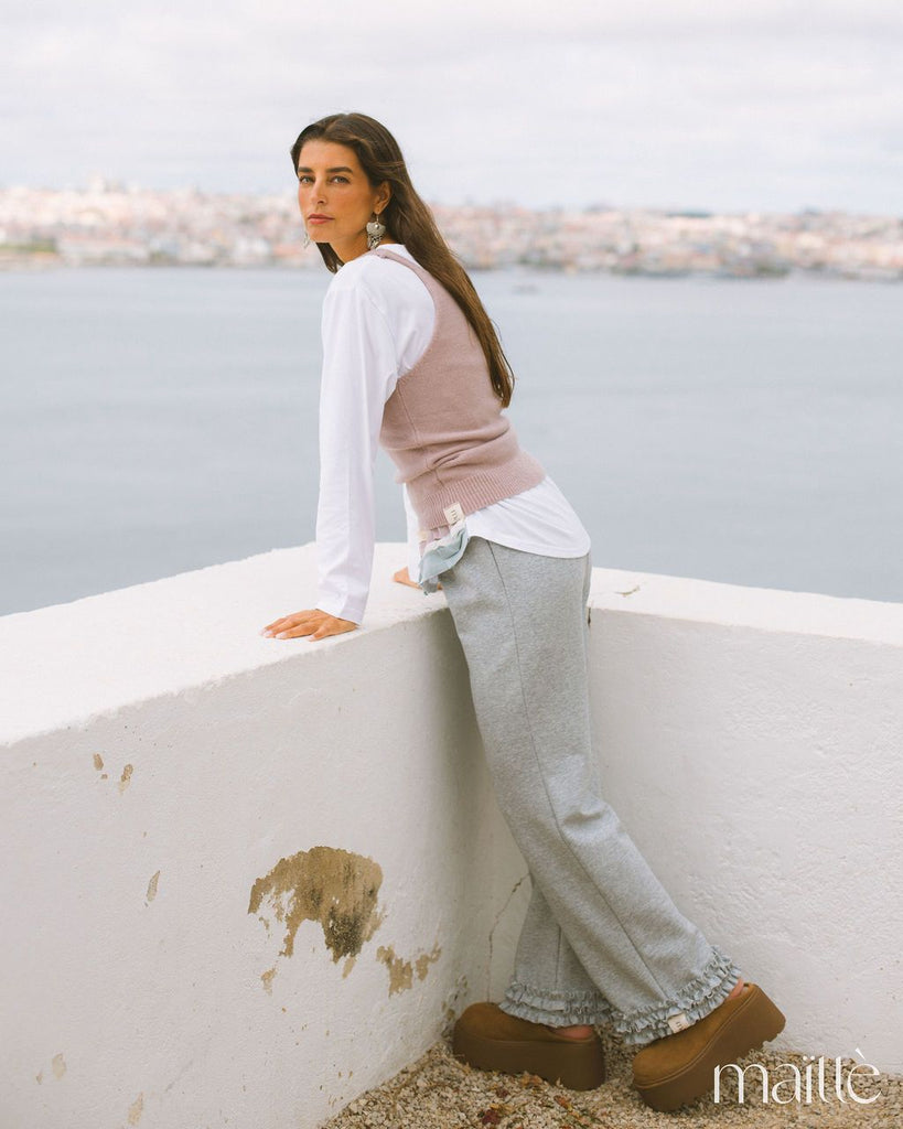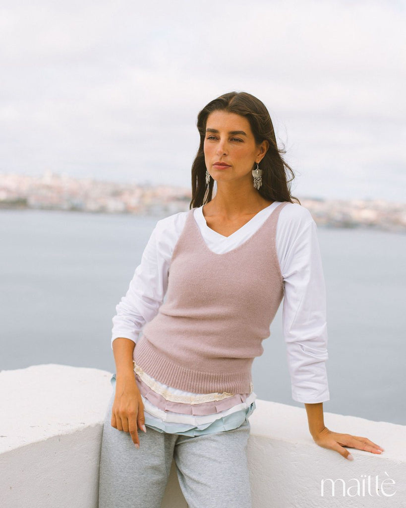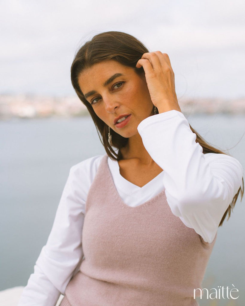 Conjunto de colete rosa de malha e básica branca de manga comprida
