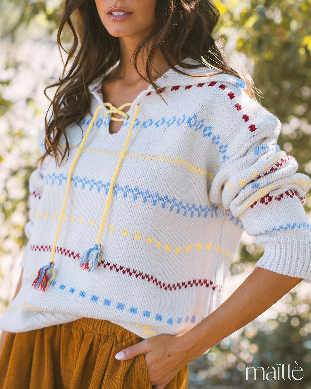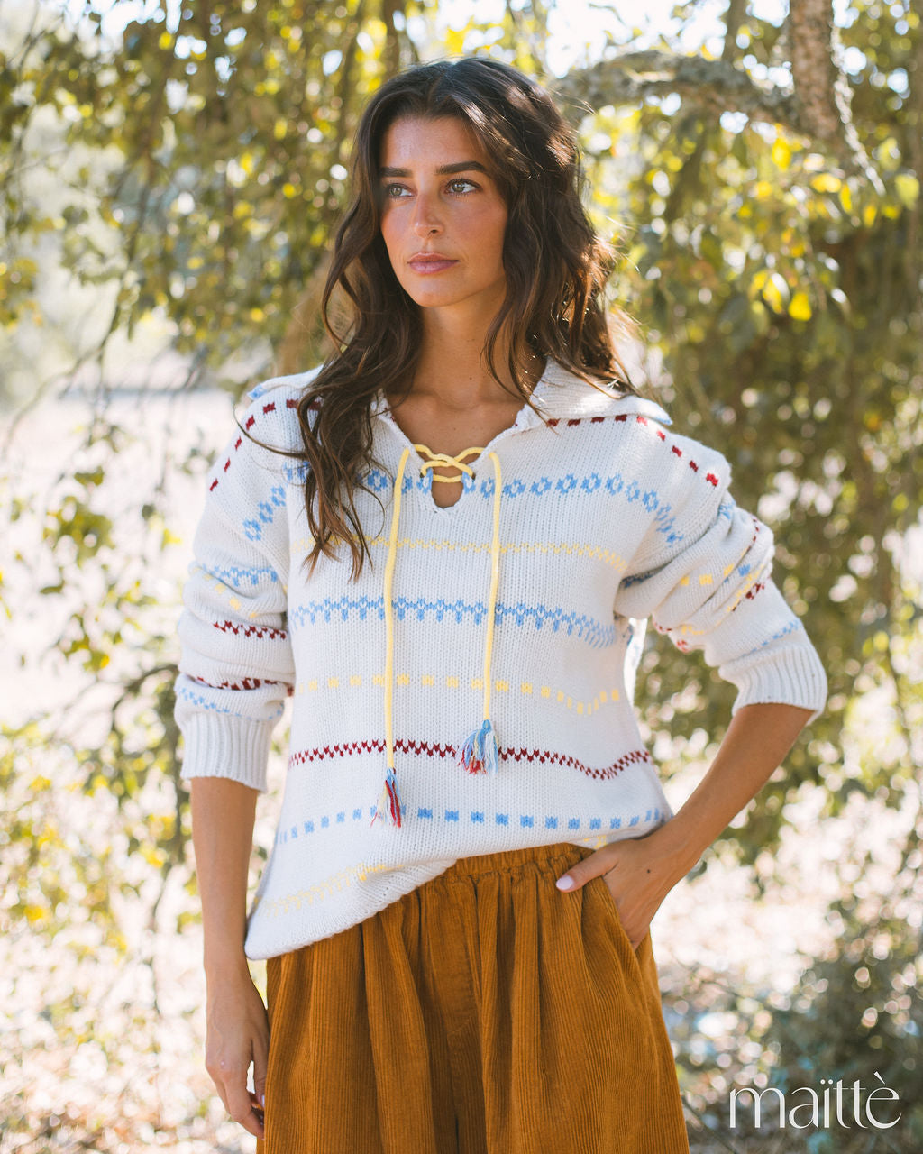 Malha bege com detalhes tricotados em tons de azul, amarelo e vermelho, acabamento com cordão no decote e punhos canelados