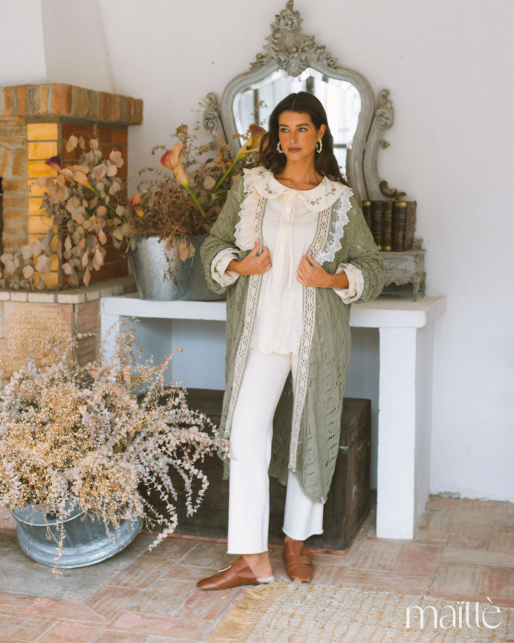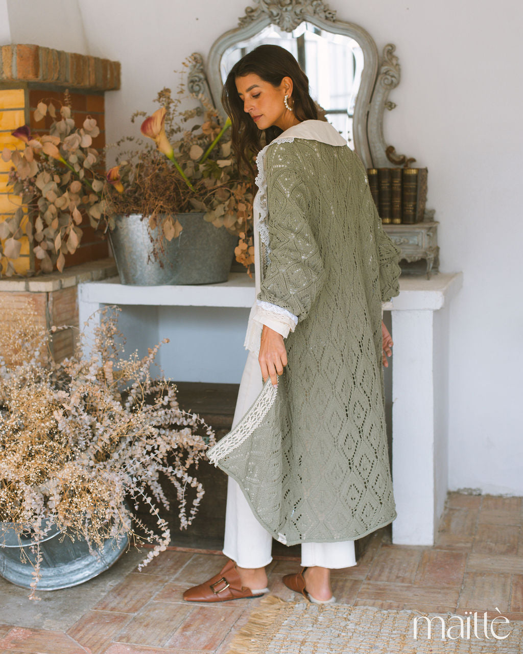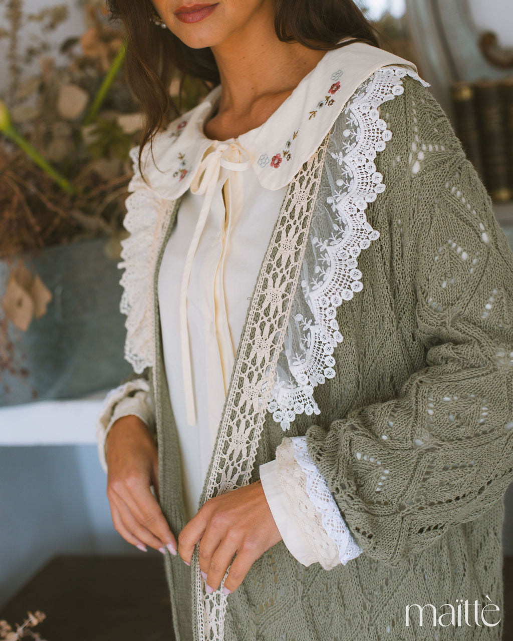 Casaco longo em croché com rendas artesanais