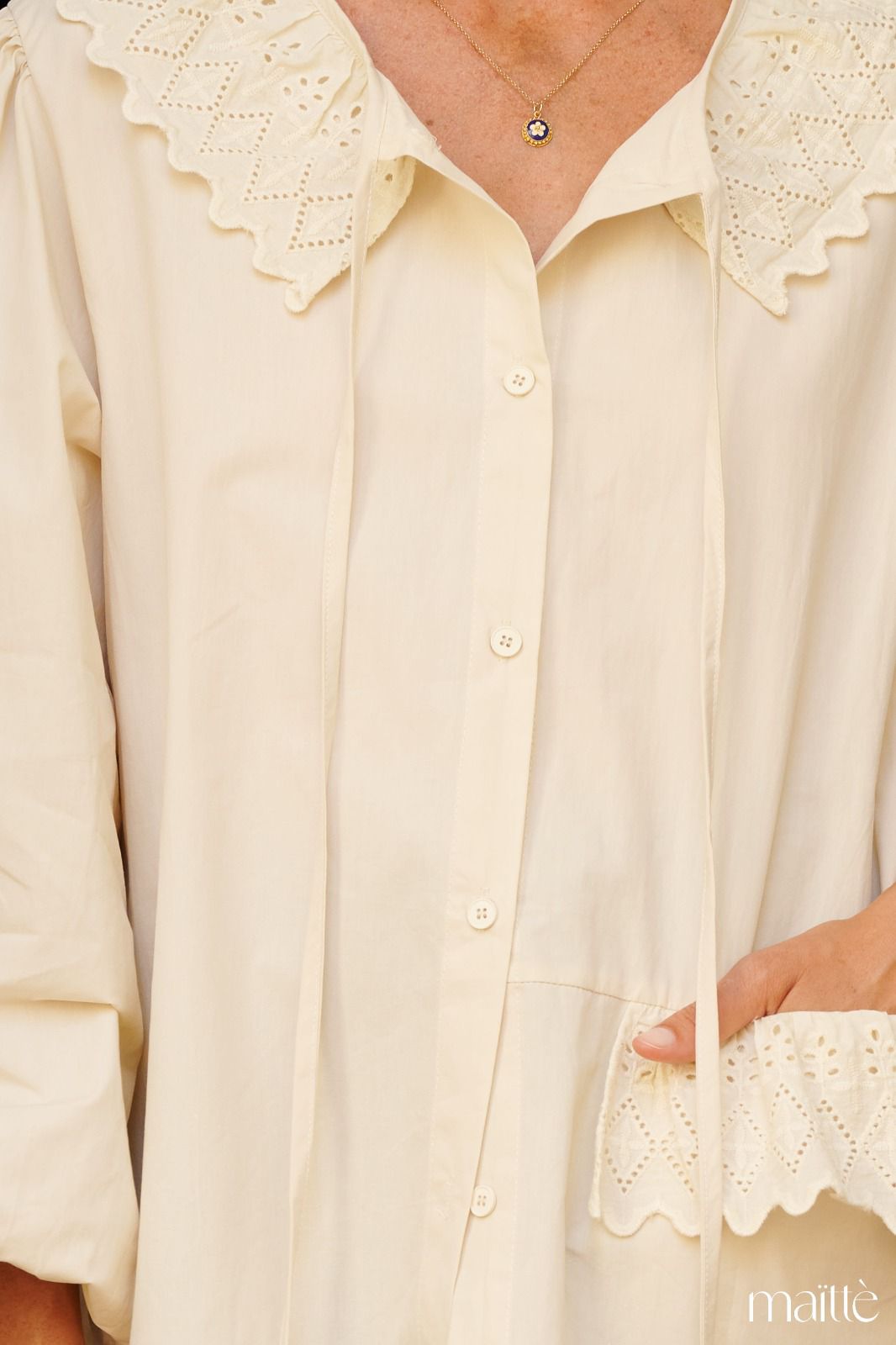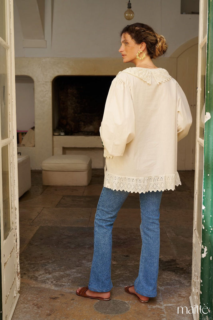 Camisa nude com folho bordado e mangas balão